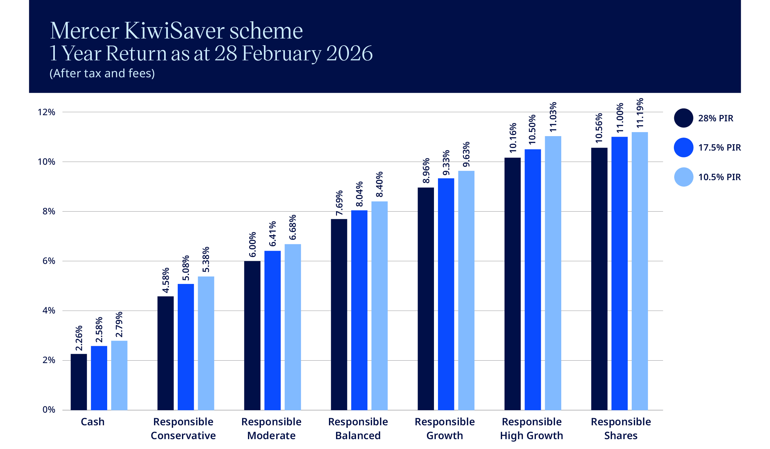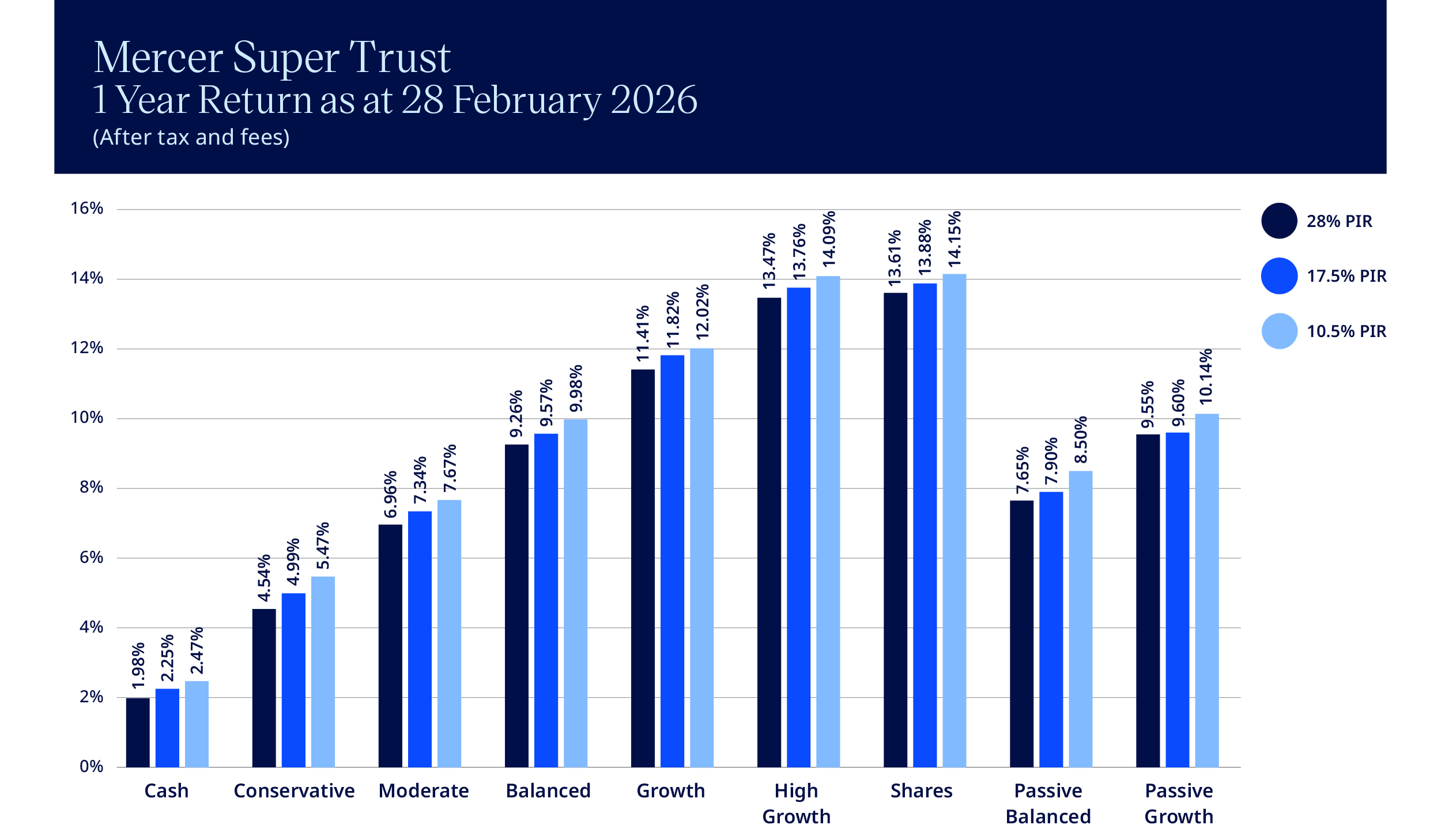 Mercer shows investment returns after fees and tax (for each of the three tax rates – PIR’s), because we believe these figures more closely reflect the actual returns you receive as an investor.