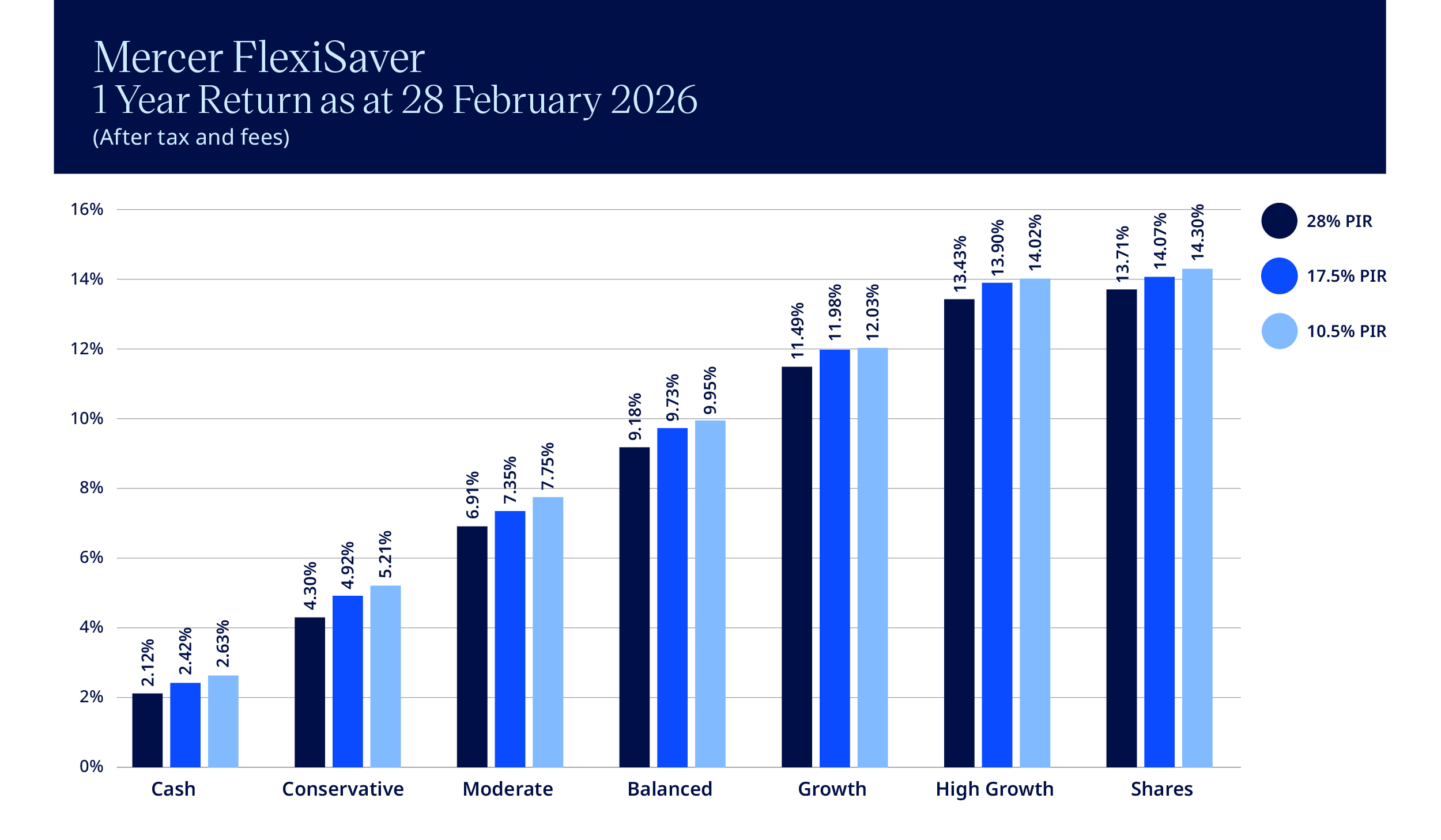 Mercer shows investment returns after fees and tax (for each of the three tax rates – PIR’s), because we believe these figures more closely reflect the actual returns you receive as an investor.